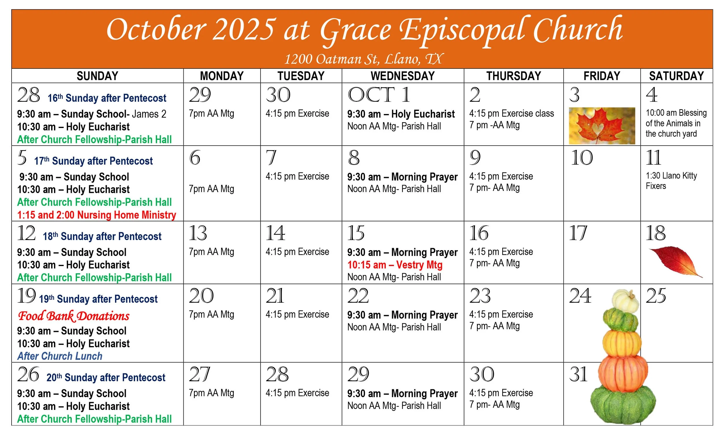 Meet in the Sanctuary (for Holy Eucharist) or Activity Building (for Morning Prayer).